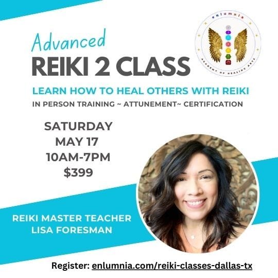 Reiki 2 Class Training Certification Symbols Attunement Practitioner Reiki Master Healer Lisa Foresman Enlumnia Dallas TX May 2025